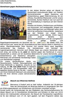 Um unsere demokratischen Werte von Menschenrecht, Freiheit, Meinungsfreiheit und freies Wahlrecht zu bewahren, braucht es nun Haltung. Am 09. Juni 2024 finden im Saarland die Kommunal- und Europawahlen statt. Ich appelliere bereits heute an Sie alle – machen Sie von Ihrem Wahlrecht Gebrauch und unterstützen Sie mit Ihrer Stimme unsere demokratischen Parteien.