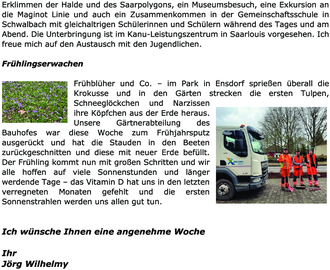 Frühblüher und Co. – im Park in Ensdorf sprießen überall die Krokusse und in den Gärten strecken die ersten Tulpen, Schneeglöckchen und Narzissen ihre Köpfchen aus der Erde heraus. Unsere Gärtnerabteilung des Bauhofes war diese Woche zum Frühjahrsputz ausgerückt und hat die Stauden in den Beeten zurückgeschnitten und diese mit neuer Erde befüllt. Der Frühling kommt nun mit großen Schritten und wir alle hoffen auf viele Sonnenstunden und länger werdende Tage – das Vitamin D hat uns in den letzten verregneten Monaten gefehlt und die ersten Sonnenstrahlen werden uns allen gut tun.