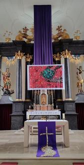 Auch in diesem Jahr hängt das große Hungertuch über dem Altar in der Eiterfelder Kirche. Das eindrucksvolle Bild des nigerianischen Künstlers Emeka Udemba (*1968), zeigt unseren Planeten „Erde“, von vier Händen gehalten. Die Bildcollage aus unzähligen Zeitungsschnipseln soll uns dazu einladen, einmal darüber nachzudenken: