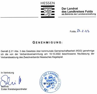 Die Verbandsversammlung des Zweckverbandes Hessisches Kegelspiel hat in ihrer Sitzung am 19.10.2022 eine Neufassung der Verbandssatzung beschlossen, die nach ihrer öffentlichen Bekanntmachung zum 01.01.2023 in Kraft tritt. Diese wird hiermit, zusammen mit der entsprechenden Genehmigung vom 22.02.2023 durch die Aufsichtsbehörde beim Landkreis Fulda, öffentlich bekannt gemacht.