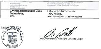 Der Gemeindewahlausschuss hat in seiner Sitzung am 04.04.2024 folgende Wahlvorschläge für die Direktwahl