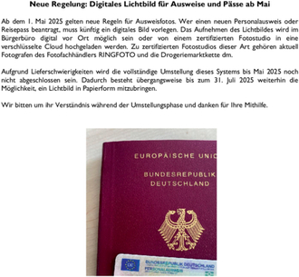 Ab dem 1. Mai 2025 gelten neue Regeln für Ausweisfotos. Wer einen neuen Personalausweis oder Reisepass beantragt, muss künftig ein digitales Bild vorlegen. Das Aufnehmen des Lichtbildes wird im Bürgerbüro digital vor Ort möglich sein oder von einem zertifizierten Fotostudio in eine verschlüsselte Cloud hochgeladen werden. Zu zertifizierten Fotostudios dieser Art gehören aktuell Fotografen des Fotofachhändlers RINGFOTO und die Drogeriemarktkette dm.