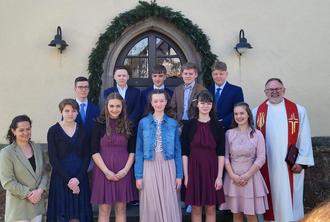 Am 28. April wurden zehn Jugendliche aus unseren Gemeinden in der Buchenauer Kirche eingesegnet. Es war der Sonntag Cantate, an dem besonders an die Kirchenmusik erinnert wird. Die war vielfältig und reich im Gottesdienst zu erleben: Der Posaunenchor Erdmannrode unter Leitung von Hans-Willi Schott bereicherte die Feier ebenso wie der Chor „Viva Cantare“ unter Leitung unserer Organistin Dagmar Schröter, die auch die Orgel im Gottesdienst spielten. Die Konfirmanden wirkten im Gottesdienst mit Lesungen und Fürbitten und liturgischen Diensten mit. Der Kurs wurde von Pfarrer Karl Josef Gruber und Annika Fee Zentgraf begleitet.