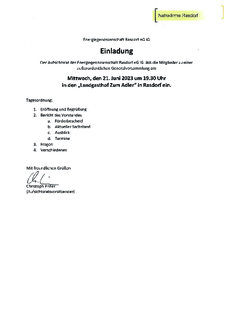 Der Aufsichtsrat der Energiegenossenschaft Rasdorf eG iG lädt die Mitglieder zu einer außerordentlichen Generalversammlung am