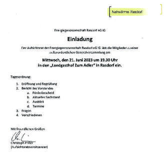 Der Aufsichtsrat der Energiegenossenschaft Rasdorf eG iG lädt die Mitglieder zu einer außerordentlichen Generalversammlung am