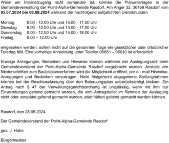 Jedermann kann den Bebauungsplan mit Begründung auf der Homepage der Point-Alpha-Gemeinde Rasdorf, unter www.rasdorf.de in der Rubrik “Amtliche Bekanntmachungen“ vom