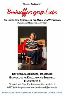 Am Samstag, 6. Juli, führt Miriam Küllmer-Vogt das Musical „Bonhoeffers große Liebe. Die unerhörte Geschichte der Maria von Wedemeyer“ in der Kreuzkirche Eiterfeld auf. Beginn ist um 19.00 Uhr. Der Eintrittspreis liegt bei 15 €. Kartenbestellung über das Ev. Pfarramt II in Eiterfeld.