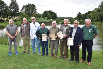 Zahlreiche Gäste konnte Vereinsvorsitzender Paul Gollowitzer beim diesjährigen Festwochenende an der Teichanlage Rasdorf begrüßen. Unter ihnen waren Kreisbeigeordnete Rita Baier und Erster Beigeordneter der Gemeinde Rasdorf Christoph Pralle in Vertretung von Bürgermeister Jürgen Hahn. Der Fischereiverein möchte das Fest dazu nutzen, um einige seiner Mitglieder, die seit 1974 und 1999 Mitglieder seien, für langjährige Treue und Unterstützung zu ehren, so Paul Gollowitzer. Sie seien Vorreiter gewesen und hätten dazu beigetragen, dass der Verein, der ca. 100 Mitglieder habe, heute über eine so schöne Teichanlage verfüge. Dafür danke er im Namen des Vereins sehr herzlich. Vereinsvorsitzender Paul Gollowitzer und Schriftführer Oliver Zopf überreichten Urkunde und Präsent für 50 Jahre an Berthold Jost, der auch 25 Jahre Schatzmeister war, Albrecht Förster, Winfried Trost und Herbert Hohmann, sowie für 25 Jahre an Christoph Klee. Im Namen der Gemeinde, die Eigentümerin der Teichanlage ist, dankte Erster Beigeordneter Christoph Pralle dem Fischereiverein für die fachgerechte und außerordentliche Pflege der Teichanlage und gratulierte den Geehrten. Er wünschte dem Verein weiter erfolgreiches arbeiten und freue sich über den guten Zusammenhalt der Vereinsmitglieder.
