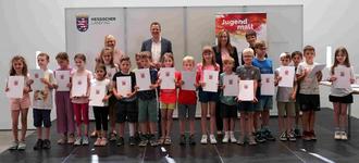 Ebenfalls zu sehen, ist eine umfangreiche Bildermappe der Klasse 2b der Grundschule Eitratal, die (hintere Reihe von links) mit ihrer Fachlehrerin für Kunst, Frau Witzel, von Staatssekretär Christoph Degen, Landtagspräsidentin Astrid Wallmann und Angela Zentgraf ausgezeichnet worden waren.