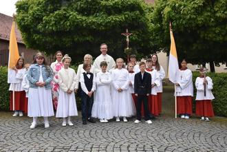 Die Erstkommunionkinder nach dem feierlichen Dankgottesdienst mit den Messdienerinnen und Messdienern, der Katechetin Dorothee, Gemeindereferentin Maria-Martina Fischer und Pfarrer Andreas Matthäi. Es fehlt Katechetin Patricia Budenz.