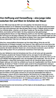 Mit dem Spielfilm „Der geteilte Himmel“ nach dem Roman der Schriftstellerin Christa Wolf findet das Sommerkino auf der großen Leinwand im US Camp der Gedenkstätte Point Alpha am Donnerstag, 4. August, ab 18 Uhr seinen Abschluss. Der Eintritt ist frei. Zu Beginn gibt es eine kompakte Einführung, um Hintergründe des Films zu erläutern. Das Team vom Black Horse Inn hält kleine Snacks und Getränke bereit. Um Anmeldung wird gebeten per Online-Ticket unter www.pointalpha.com/veranstaltungen , per Mail service@pointalpha.com oder Telefon 06651/919030.