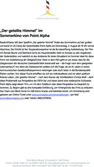Rasdorf/Geisa. Mit dem Spielfilm „Der geteilte Himmel“ findet das Sommerkino auf der großen Leinwand im US Camp der Gedenkstätte Point Alpha am Donnerstag, 4. August ab 18 Uhr seinen Abschluss. Der Eintritt ist frei. Kooperationspartner ist die Bundesstiftung Aufarbeitung. Der Film mit Renate Blume und Eberhard Esche als Hauptdarsteller steht im Kontext zu den Angeboten der Gedenkstätte und natürlich ist das Ambiente für einen Kinoabend im Sommer ideal für diese Form von Aufarbeitung der Zeitgeschichte. Denn in dem Film geht es um etwas, dass für die Zeitgenossen der deutschen Zweistaatlichkeit existenziell war – die Frage nach dem geeigneten Lebensentwurf. Vor allem die Ostdeutschen stellten sich die Frage, ob sie ihr Leben in einem kommunistischen Gesellschaftsexperiment verbringen oder doch lieber in die Bundesrepublik fliehen wollten. Von dieser Flucht erhofften sie sich ein individuelleres und vor allem politisch freieres Leben. „Der geteilte Himmel“ – nach dem Roman der Schriftstellerin Christa Wolf – stellt diese Problematik aus Perspektive der DEFA dar und bietet damit eine ostdeutsche Sichtweise.