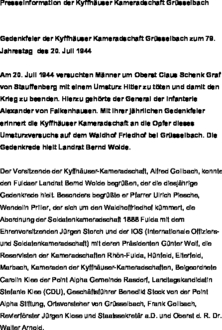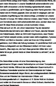 Am 20. Juli 1944 versuchten Männer um Oberst Claus Schenk Graf von Stauffenberg mit einem Umsturz Hitler zu töten und damit den Krieg zu beenden. Hierzu gehörte der General der Infanterie Alexander von Falkenhausen. Mit ihrer jährlichen Gedenkfeier erinnert die Kyffhäuser Kameradschaft an die Opfer dieses Umsturzversuchs auf dem Waldhof Friedhof bei Grüsselbach. Die Gedenkrede hielt Landrat Bernd Woide.