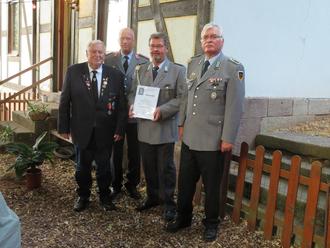 Die Gedenkfeier endete mit einer Kranzniederlegung, dem gemeinsamen Singen unserer Nationalhymne und einem Trompetensolo von David Helmke. Während der anschließenden Zusammenkunft im Gasthaus Felsenkeller sprachen der Ehrenvorsitzende der Fuldaer Soldatenkameradschaft Jürgen Storch, die Landtagskandidatin Stefanie Klee und der Präsident der Internationalen Offizier- und Soldatengesellschaft e.V. Hauptmann d. R. Günter Wolf ein Grußwort und verlieh die Ehrennadel in Bronze an Alfred Gollbach, Manfred Aha und Norbert Biedenbach.
