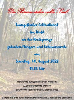 Am 14. August feiern wir einen Kirchspielgottesdienst im Wald. Der Gottesdienstplatz liegt in der Nähe der Kreisgrenze zwischen Mengers und Erdmannrode. Ein Hinweis ist von der Landstraße aus zu sehen. Zwei Wandergruppen starten um 10.30 Uhr in Branders und am Friedhof in Erdmannrode. In der Nähe des Gottesdienstplatzes gibt es auch ein paar Parkplätze, die man denjenigen vorbehalten sollte, die nicht weit laufen können. Der Gottesdienst im Freien kann auch Anlass für eine Fahrradtour sein. Er beginnt ca. 11.00 Uhr. Der Posaunenchor Erdmannrode gestaltet ihn musikalisch. Im Gottesdienst werden zwei Kinder getauft.
