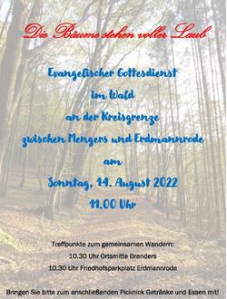 Am 14. August feiern wir einen Kirchspielgottesdienst im Wald. Der Gottesdienstplatz liegt in der Nähe der Kreisgrenze zwischen Mengers und Erdmannrode. Ein Hinweis ist von der Landstraße aus zu sehen. Zwei Wandergruppen starten um 10.30 Uhr in Branders und am Friedhof in Erdmannrode. In der Nähe des Gottesdienstplatzes gibt es auch ein paar Parkplätze, die man denjenigen vorbehalten sollte, die nicht weit laufen können. Der Gottesdienst im Freien kann auch Anlass für eine Fahrradtour sein. Er beginnt ca. 11.00 Uhr. Der Posaunenchor Erdmannrode gestaltet ihn musikalisch. Im Gottesdienst wird ein Kind getauft.