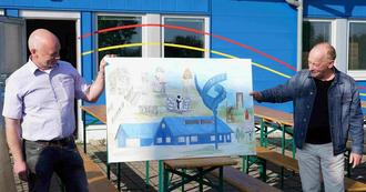 Überraschungs-Geschenk aus den Reihen der neuen Gästeführer: Rolf Orthey (rechts) hatte ein Gemälde mit Motiven der Gedenkstätte und aus der deutschen Geschichte gezeichnet und es gemeinsam mit Roland Wenzel dem Point-Alpha-Vorstand überreicht.