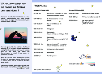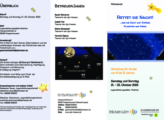 Alle lieben einen funkelnden Himmel mit vielen Sternen, Sternschnuppen und einem großen Mond. Dabei ist es gar nicht mehr so leicht, eine natürliche Nacht zu erleben. Aber was genau ist eine natürliche Nacht? Und was können wir tun, um die Sicht auch in der Stadt auf Sterne, die Milchstraße und die Planeten zu retten? Und was hat das Insektensterben mit Licht zu tun? All das erfahren Kinder im Alter von acht bis 12 Jahren beim Workshop „Rettet die Nacht“, der am Samstag und Sonntag, 21. und 22. Oktober 2023 in der Jugendbildungsstätte in Rodholz stattfindet.