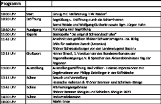 | 13:15 Uhr | Bühne | Besuch und Vorstellung Hessische Hoheiten & Rhöner Brenner- und Schinken-Könige |
