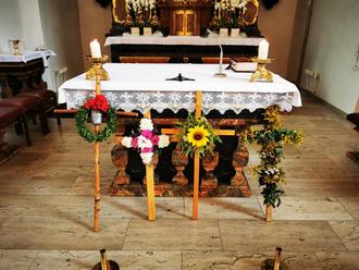 Mit dem Wallfahrtsheft unter dem Motto „Dem Leben zu dienen ist gut“ hatten sich die Gruppen mit festlich geschmückten Kreuzen auf den Weg gemacht. Anhand der Texte machten sich die Frauen in 3 Stationen Gedanken über das „JA zur Freiheit - NEIN zum Bösen“, „Gutes tun - statt Wegschauen und Unterlassen“ und „Frei, das Gute zu wählen“.