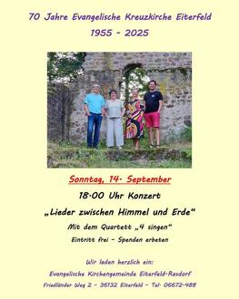Am Sonntag, 14.9., laden wir zu einem Konzert mit dem Quartett „4singen“ in die Kreuzkirche ein. Das Quartett singt „Lieder zwischen Himmel und Erde“. Der Eintritt ist frei, Spenden werden erbeten. Beginn ist um 18.00 Uhr.