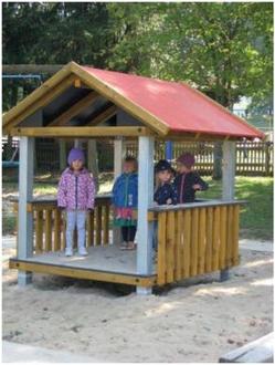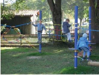 Nach den Ferien gab es eine große Überraschung, denn da konnten sich alle Kindergartenkinder auf neue Spielgeräte freuen. Einen wunderschönen Niedrigseilgarten mit fünf Elementen und ein hübsches Spielhaus mitten im Sandkasten. Die Geräte wurden von der Firma Hüfner aus Burghaun hergestellt. Die Außenspielgeräte konnte die Leiterin der Kindertagestätte Kornelia Diemerling von den Erlösen der Sommerfeste und der Martinsfeiern, sowie sonstigen Spenden, anschaffen. Die Gemeinde gab einen Betrag von 3.000 Euro dazu und übernahm die Aufstell- und Aufbauarbeiten durch die Mitarbeiter des Bauhofs. Die Kinder klettern täglich an der Kletteranlage und auch das Spielhaus wird als Eisdiele, Pizzeria und Bäckerladen von den Kindern kreativ genutzt.