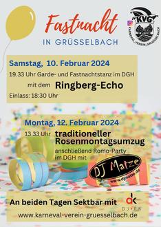 Der Karneval-Verein Grüsselbach 1956 e. V. lädt alle Närrinnen und Narren, Fußgruppen und Fastnachtswagen ein, sich für den Rosenmontagsumzug in Grüsselbach anzumelden.