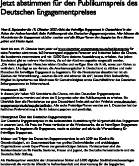 Noch bis zum 19. Oktober kann jeder auf www.deutscher-engagementpreis.de/publikumspreis für seine Favoriten abstimmen. 463 herausragend engagierte Personen und Initiativen haben die Chance, die bundesweit renommierte und mit 10.000 Euro dotierte Auszeichnung zu erhalten. Aus jedem Bundesland gibt es mehrere Nominierte, die auf der Abstimmungsseite vorgestellt werden.