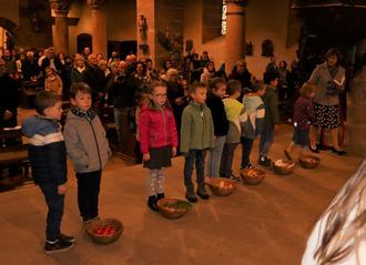 „Goldene Ähren bringen reiche Frucht“ – die katholische Kindertagesstätte St. Johannes der Täufer, unter Leitung von Cornelia Diemerling, gestaltet unter diesem Thema den Gottesdienst zum Erntedankfest in der Rasdorfer Stiftskirche. Die Kinder hatten als Gaben Getreide, Kartoffeln, Äpfel, Möhren und Tomaten mitgebracht und stellten sie zu den Früchten und Gemüsen vor dem Hauptaltar.