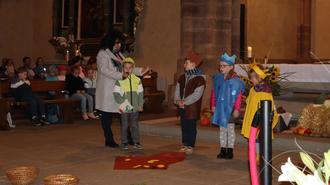 Die Schulanfänger der Kindertagesstätte spielten als Bauer, Vögel, Sonne, Dornhecke, Guter Boden und Regen verkleidet, das Gleichnis vom Sämann. Sie schlossen ihre Darbietung mit: „Gute Erde, Sonne und Regen, das alles hat uns Gott gegeben. So wächst aus einem Korn heran, ein Halm mit vielen Körnern dran, teils hundertfach, teils sechzigfach, teils dreißigfach.“