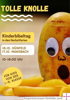 Am Mittwoch, 16.10. im Ev. Gemeindehaus Hünfeld, oder am Donnerstag, 17.10., im Gemeindehaus in Mansbach laden wir Kinder der 1. - 6. Klasse zu einem Kinderbibeltag ein. „Tolle Knolle“ ist das Thema des Tages. Jeweils von 10.00 Uhr -16.00 Uhr gibt es ein interessantes Programm für Kinder inklusive Mittagessen. Es wird ein Teilnehmerbeitrag 3 €/Kind erbeten. Anmeldungen bitte bei Eva-Maria Sirsch, E-Mail: EvaMariaSirsch@gmail.com.