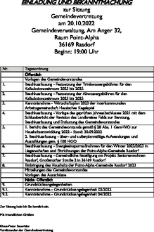 | 8. | Einbringung des Haushalts der Point-Alpha-Gemeinde Rasdorf 2023 Mitteilungen des Gemeindevorstandes |