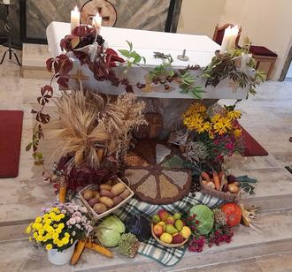 Der Altar in Grüsselbach zum Erntedank 2025, gestaltet von Alfred und Anita Gollbach sowie Judith Hahn und Angelika Förster