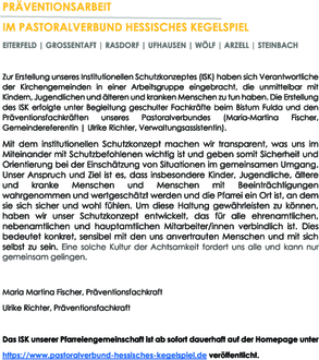 Zur Erstellung unseres Institutionellen Schutzkonzeptes (ISK) haben sich Verantwortliche der Kirchengemeinden in einer Arbeitsgruppe eingebracht, die unmittelbar mit Kindern, Jugendlichen und älteren und kranken Menschen zu tun haben. Die Erstellung des ISK erfolgte unter Begleitung geschulter Fachkräfte beim Bistum Fulda und den Präventionsfachkräften unseres Pastoralverbundes (Maria-Martina Fischer, Gemeindereferentin| Ulrike Richter, Verwaltungsassistentin).