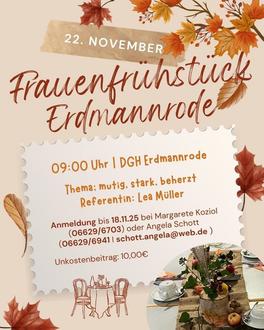 Am Samstag, dem 22.11.2025, findet um 9 Uhr das diesjährige Frauenfrühstück im DGH Erdmannrode statt. Referentin ist die Pfarrerin der Kirchengemeinden Burghaun und Rothenkirchen, Lea-Katharina Müller. Anmeldungen bitte bis zum 18.11.2025 bei Angela Schott (Tel. 06629/6941, schott.angela@web.de) oder Margarethe Koziol (Tel. 06629/6703).