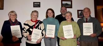 Beim Jahresrückblick ehrte Pfarrer Ulrich Piesche (hinten) (von links nach rechts) Christiane Herber und Gisela Budenz (beide 60 Jahre), Christina Weller, Marianne Röhr und Siegfried Schilling (alle drei 25 Jahre)