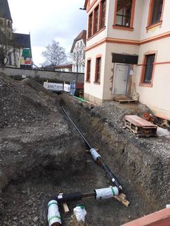 Die Trockenbauarbeiten schreiten gut voran und sind wesentlicher Bestandteil des Umbauprozesses. Dieser ermöglicht die Gestaltung flexibler Grundrisse und die individuelle Anpassung der Räumlichkeiten. Im Bereich der Elektroinstallation wird momentan an einer modernen technischen Ausstattung gearbeitet. Die gute Raumaufteilung und moderne Technik soll den zukünftigen Nutzern eine optimale Wohlfühlatmosphäre bieten. Auch dieses Gebäude soll später an die Nahwärme in Rasdorf angeschlossen werden. Dazu werden bereits die Hausanschlussleitungen verlegt.