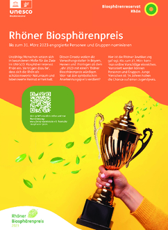 Der Rhöner Biosphärenpreis soll ein möglichst breiter Beteiligungsprozess werden – die Rhöner Bevölkerung entscheidet selbst, wer nominiert wird. Bürgerinnen und Bürger sind deshalb ab sofort aufgerufen, Personen ab 14 Jahren oder Gruppen vorzuschlagen, die ihrer Meinung nach den Biosphärenpreis verdient hätten. Hierzu wird auf der Homepage ein Formular ausgefüllt, in dem man ganz persönlich begründen kann, was das Engagement der Nominierten zu etwas Besonderem macht. Alle Infos, Teilnahmebedingungen und das Formular findet man unter www.biosphaerenreservat-rhoen.de/biosphaerenpreis. Vorschläge können bis zum 31. März eingereicht werden.