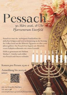 Feiert gemeinsam am Montag, 30.03.2026 um 18 Uhr mit Dechant Markus C. Günther eines der wichtigsten Familienfeste der jüdischen Religion und erfahrt was Pessach und Ostern miteinander verbindet. Die Feier mit Festmahl kostet pro Person 25 €. Eine Anmeldung ist bis Freitag, 20.03.2026 im Zentralen Pfarrbüro (Tel. 06672/388) oder auf der Homepage des Pastoralverbundes möglich. Die Anzahl der Gäste ist auf 30 Personen begrenzt.