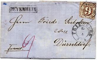 Der bisher einzige bekannte Beleg mit dem Landpoststempel des Ortes „BEYENHEIM“ stammt aus dem Jahr 1863. Absender ist ein Reisender, der diesen Brief in Maulbach bei Homberg a.d. Ohm am 11. April 1863 an Herrn Seebohm zu Düsseldorf geschrieben hatte.