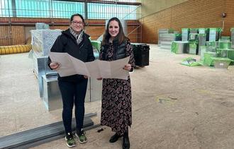 „Unsere Vereine brauchen ebenso Raum für ihre Aktivitäten, wie viele Bürgerinnen und Bürger für Familienveranstaltungen und Feste. Mir ist es wichtig, dass wir in jedem Stadtteil ein modernes und gut nutzbares Bürgerhaus als Begegnungsstätte und Treffpunkt vorhalten. Dafür müssen wir regelmäßig in diese Infrastruktur investieren, so wie wir es gerade hier in Dorn-Assenheim machen“, berichtet Reichelsheims Bürgermeisterin Lena Herget im Rahmen einer Baustellenbegehung in der Sport- und Festhalle in Dorn-Assenheim. Gemeinsam mit Jutta Turba verschaffte sich Herget einen Überblick über den aktuellen Stand der umfangreichen Baumaßnahmen. Turba ist Mitarbeiterin in der Bauverwaltung der Stadt Reichelsheim und verantwortet das Projekt.