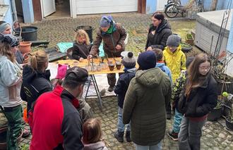 Im Hof unseres Mitglieds Siggi Schmitz durften die Kinder zunächst dabei helfen, aus zerlassenem Rinderfett und Sonnenblumenkernen Meisenringe herzustellen und Futtertassen für die Vogelfütterung zu befüllen. Für ein paar Futterrinnen reichte das Fett auch noch.