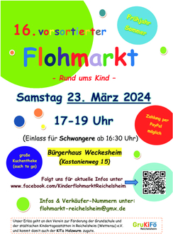 Es gibt eine Woche vor Ostern viele tolle Sachen günstig zu erstehen...Kleidung, Schuhe, Sommerartikel, Zubehör rund ums Kind, Rädchen & Fahrzeuge, Sitze, CD, Bücher, Spielzeug und vieles mehr. Der Erlös aus dem Flohmarkt, der durch einen Eltern-Zusammenschluss von Eltern der Grundschule im Ried (Reichelsheim) sowie der Kindertagesstätte Holzwurm organisiert wird, wird an den Förderverein GruKiFö gespendet.