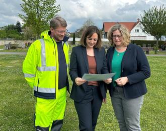 Bauhofleiter Nils Tolksdorf, Bürgermeisterin Lena Herget und Rathausmitarbeiterin Miriam Euler besprechen die letzten Schritte zur Umsetzung des neuen Bestattungsangebotes vor Ort; Quelle: Stadt Reichelsheim, Andrea Fourier