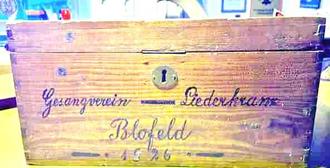 Holzkiste (1926) mit allen bekannten Unterlagen zum Blofelder Gesangverein. Foto: Friedel Schmidt, Blofeld
