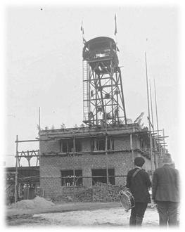 Die Aufnahme entstand während der Feierlichkeiten zum Richtfest des hier abgebildeten Haupförderschachtes "Weckesheim Alt" um 1933