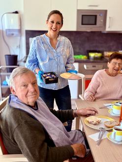 An diesem Tag ist nur ein Mann unter den Damen im Babbelstübchen. Der 87-Jährige erkennt die Bürgermeisterin sofort und freut sich sehr. „Grüßen Sie mir ihre Oma ganz herzlich. Wir waren zusammen in der Herzsportgruppe. Es war herrlich, als ich noch im Verein aktiv war“, schwärmt er direkt. Das Erzählen, Erinnern und Reden ist ein sehr wichtiger Punkt in der Tagespflege. Beim Frühstück sitzt er neben einer Dame aus Echzell, die er bereits seit der Grundschule kennt - da hat man sich viel zu berichten.
