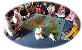 Aufmerksam lauschte die Gruppe der Geschichte vom Eisbären Rudi, der von seiner Mama gerettet werden musste, weil seine Eisscholle zu schmelzen begann.