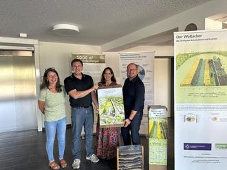 Die Ausstellung Weltacker 2000 wurde im Reichelsheimer Rathaus eingeweiht (von links): Monika Brenninger (Solidarische Landwirtschaft Guter Grund Wölfersheim), Wolfgang Dittrich (Referent für gesellschaftliche Verantwortung beim evangelischen Dekanat Wetterau), Lena Herget (Bürgermeisterin der Stadt Reichelsheim), Rouven Kötter (Vorsitzender des Ausschusses für Regionalentwicklung, Umwelt und Wirtschaft des Wetteraukreis