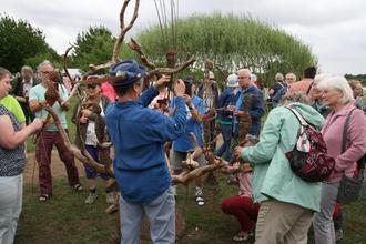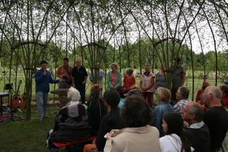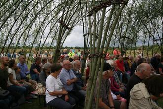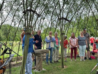 Thomas Hofmann, für den der Weidenpavillon ein Leuchtturm seiner Arbeit sei, stellte das Team und die einzelnen Arbeitsschritte nochmals vor – bevor er zu einer Flechtvorführung einlud. Aus unmittelbarer Nähe konnte man das Flechten beobachten. Für die Kinder gab es die Möglichkeit, den Seiltanz zu erproben. Musikalisch umrahmt wurde die Eröffnung von Jessica Born und Georg Crostewitz.